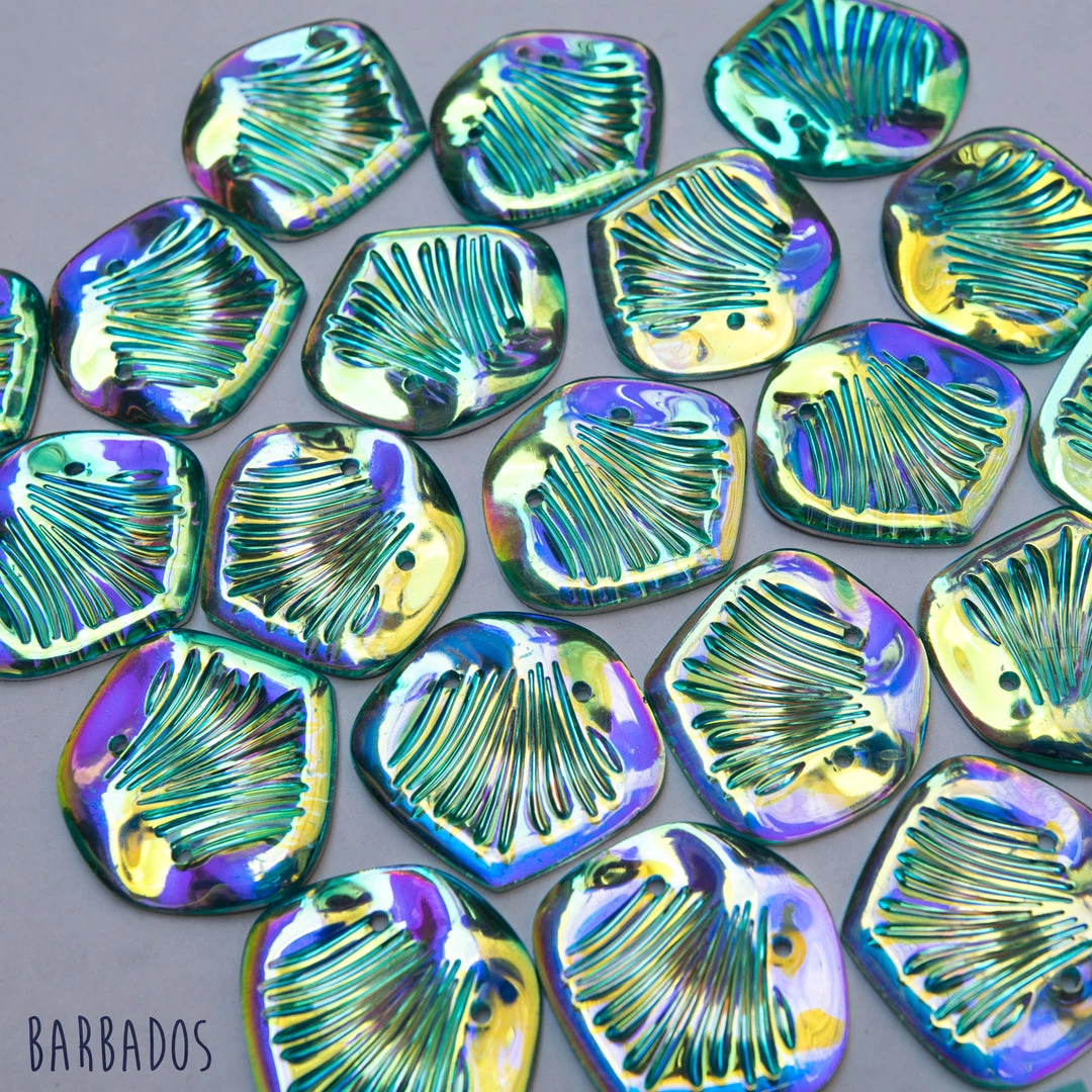 Finfolk Productions Iridescent Mythic Scales are a one-of-a-kind product! Perfect to create mermaid accessories, or even your own tail! These scales are resin with an iridescent finish, and come ready to be sewn, glued, or tied onto any project.