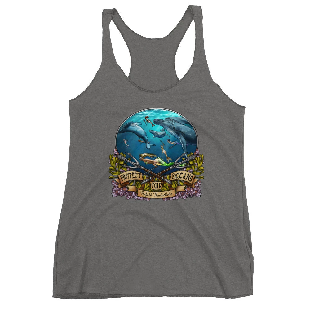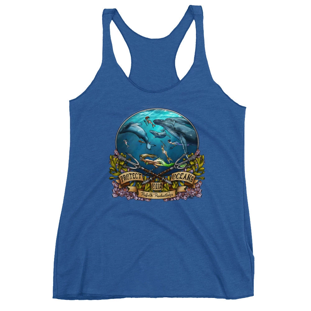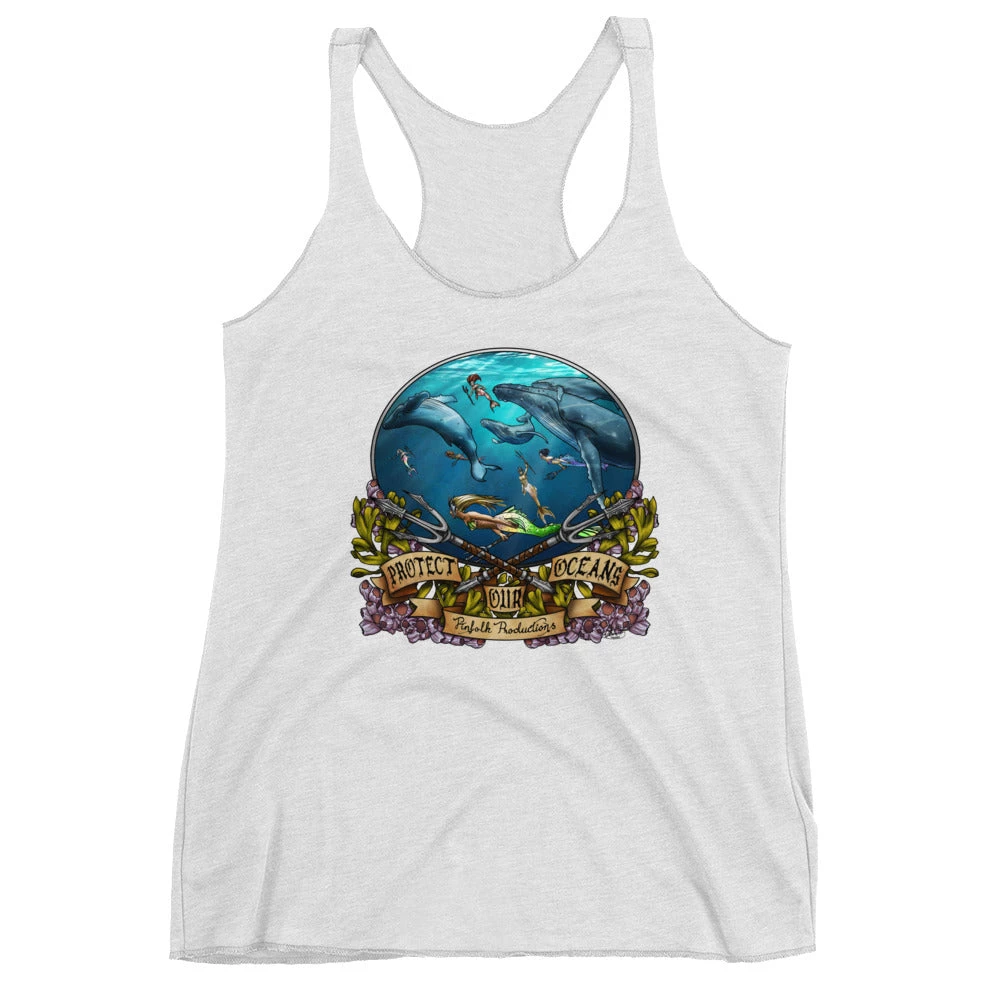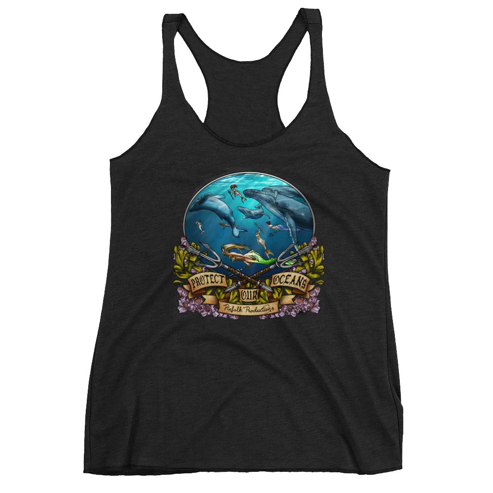 This racerback tank is soft, lightweight, and form-fitting with a flattering cut and raw edge seams for an edgy touch. It features our Pod Protectors design as seen in the 2019 Eco Box.