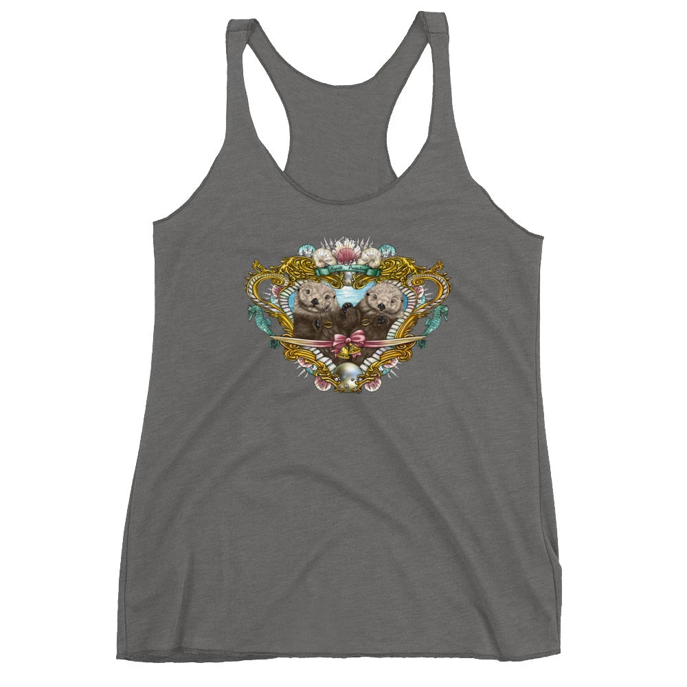 This racerback tank is soft, lightweight, and form-fitting with a flattering cut and raw edge seams for an edgy touch. It features our special Otterly in Love design as seen in the 2019 Little Box of Love to commemorate the wedding of Bryn & Zach.